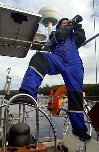 ON NESSIE-DETAIL: Finn Olav looking for Nessie as we enter into Loch ness. With a camcorder and a foot on the wheel he is ready for almost everything. We were lucky with the weather across the world famous lake (sorry, loch!)