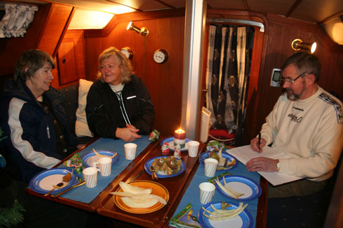 It is a strange thing to think about, the fact that we will be celebrating our next Christmas in Brazil. We have already been contacted by a couple of friends of us, who want to come and visit us! That will be a different Christmas. And since we have always been very kind-hearted, Santa Claus paid us a visit. Rune was unfortunately outside then, so he missed the big visit. But that?s life. Better luck next year! The boat was well docked, and the weather gods were in a good mood. It was a cold, quiet afternoon, and the star spangled polar night soon overcame the thin stream of light in the southwest of the horizon. So there we sat together, just enjoying the food and the new year, that will be so exciting and different. We wish everybody out there a happy, peaceful New Year from us on board S/Y Underveis!
