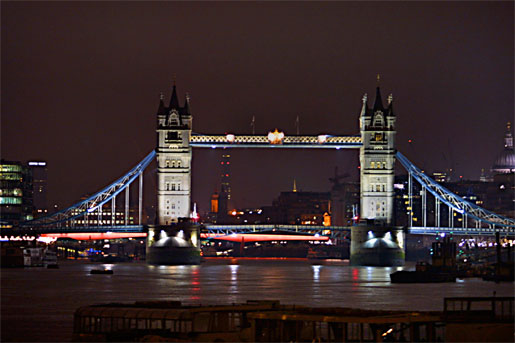 LANDMARK: Tower bridge across the Thames is the symbol for London. The bridge has been attempted sold to Americans and Arab oil Sheiks by con artists on several occasions. To the right you can see a glimpse of the dome of St. Pauls Cathedral.