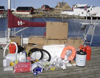 For Finni, finding work to do this Easter, will not pose any problem. With the last shipment from Maritim AS just arrived, there is more than enough work to be done. Of the projects that are now being concluded, putting in place pressurized water is the most complicated. And two smaller water storage tanks are being replaced by one big one. This gives us a few more gallons of water storage. In addition, we are putting in place a small water heater. In order to do this, we have to reconstruct the exhaust system a little bit. An electrical water pump and accumulator tank must also find their place on board. When all this work is finished, we will have hot water in the tap in the galley, and there will be a fresh water shower in the cockpit, also with hot water. We also have to camping type showers onboard. And Finni has the parts required to making a saltwater hose for use on the deck. Good to have if you need to clean something, and don’t want to waste precious fresh water.
