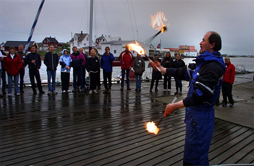 Finn Olav had invited John-Tonny Johnsen and Martin Jensen, two boys from his local childrens circus, “Circus Ut-Røst” to show off their flame throwing act on the occasion. Despite rainy weather and dark grey skies, the show went on as planned, and the flames rose several meters into the sky.