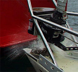 IN A THOUSAND PIECES: The airborne Azeri champagne bottle went to a thousand pieces when godmother Solveig Seines sent it crashing into the bough of S/Y Underveis.