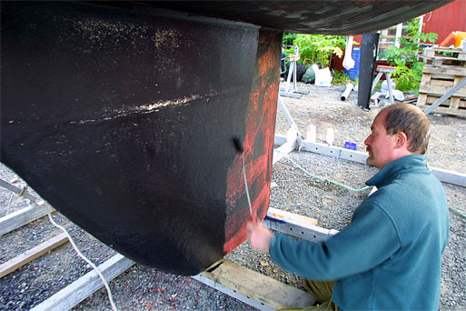 CHEERFUL BLACK: The underwater hull looked much better than we had expected after a year and a half in constant seawater. Here Finn Olav is painting a new coat on.