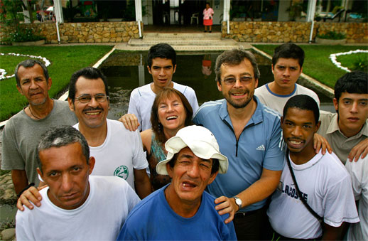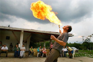 IN FLAMES: Finn Olav spewing flames for the guys at a rehab farm for mentally ill in Cali, receiving great applause from the audience.