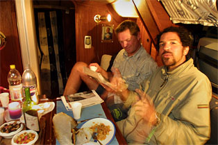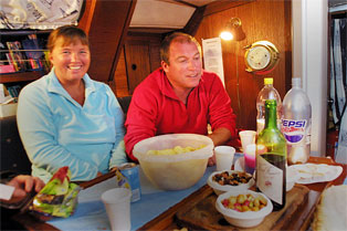 PARTY ON BOARD: We have been very outgoing in Las Palmas, and here we are having a bacalao-party onboard the Underveis. We brought it all the way from Bergen, and the recipe was given to us by Marilyn at Smola. From the left side: Ann Kristin and Morten from S/Y Sunflower, Petter William Andersen from S/Y Pauline and Paolo from Minas Gerais in Brazil, from the Leah. With the 26 foot Leah Paolo has sailed from France, through the Mediterranean for five years, and he is now in the Atlantic. He is on his way back to the mountain village he came from, but he has no idea when he will be there. A great guy, whom we first met in Safi in Morocco, and after that we have met him again several times.