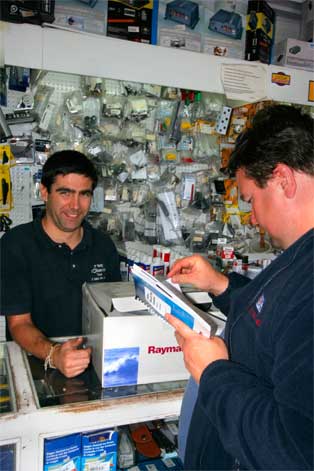 THE BEST: The chandleri Rolnautic in Puerto La Luz is number one when it comes to assortment and service. Here, Enrique smiles his biggest smile after selling Rune a brand new autopilot. Enrique speaks English, and without him and his attitude, we wouldn’t have come far.