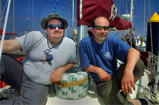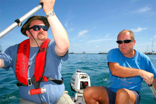 ROW, ROW YOUR BOAT: Rune and Morten from S/Y Sunflower take to the ores after we ran out of gas. We had to anchor for a few days at first, and went back and forth all the time.