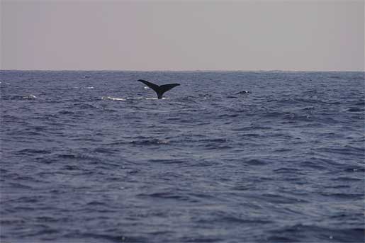 FIN WHALE: On our passage from Lanzarote to Gran Canary, Finn Olav heard breathing sounds. As he turned around, this 35 foot fin whale emerged, swimming past us. It kept going for a few hundred yards, splashing and breathing, before it disappeared into to the abyss.