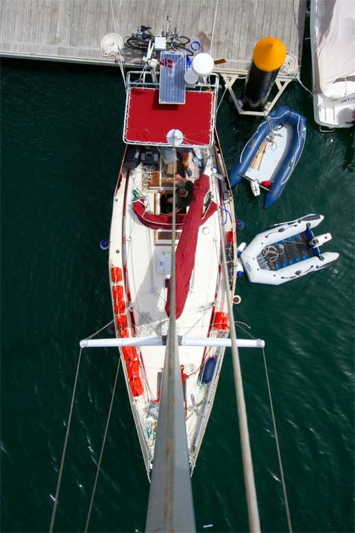 BIRDS PERSPECTIVE: Finn Olav has had a couple of climbs up in the rig during our stay in Las Palmas. Fitting new lantern bulbs, inspecting the forestay and repairing the wind instruments are among the things we have had done, some 40 feet above sea level.