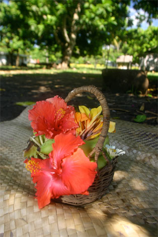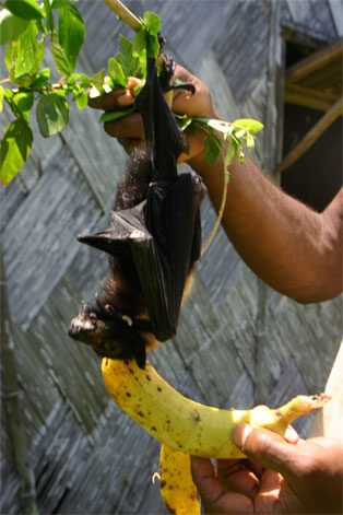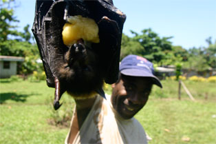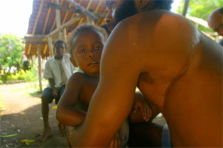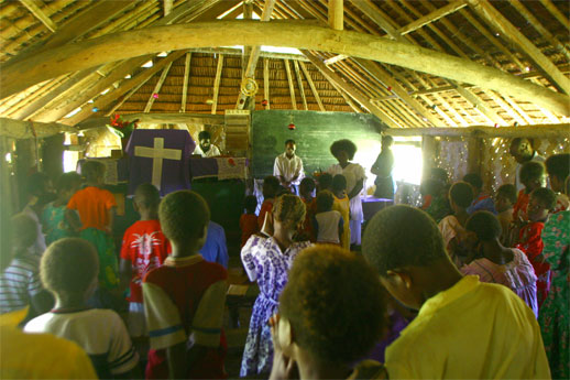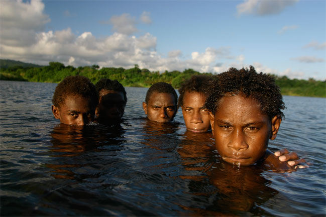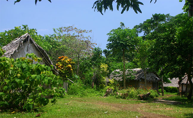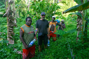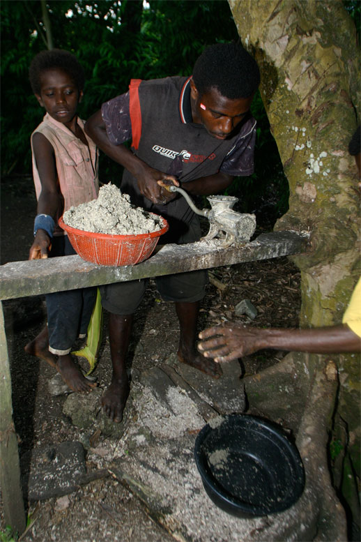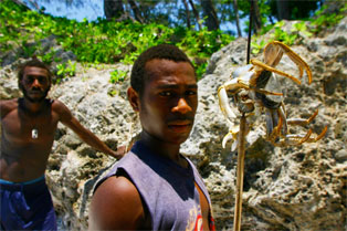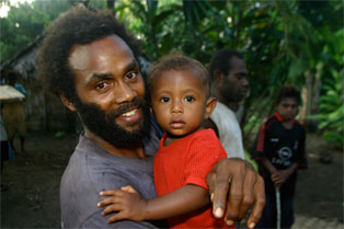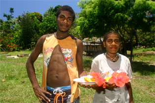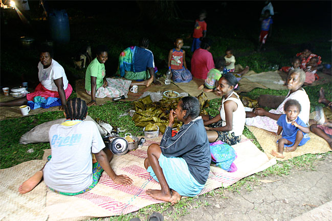 Noen unggutter løper til og bærer sekkene våre opp den bratte stien til selve landsbyen. Alle husene er av palmeblader, selv om kirken og skolen minner oss om at misjonærene og storsamfunnet er i ferd med å føle seg fram og feste grepet også her. Det er bare 20-30 år siden beboerne i landsbyen ble kristne, og fortsatt sitter den lokale tradisjonen med jungelånder og overnaturlige krefter sterkt i folkesinnet. Som vi skal få merke mye til i løpet av den halvannen uken vi er i Malfakal, kjenner gjestfriheten ingen grenser. Vi får vår egen hytte, vi blir gitt tre overdådige måltider hver dag, og blir vist rundt i landsbyen og nærområdet. Favoritten på matfronten er laplap, en slags pudding de tilvirker av kassavarot og bananblader. Laplap med kjøtt, fisk eller skjell. Alt smaker like godt. Og frukten faller bokstavelig talt i hodet på oss.
