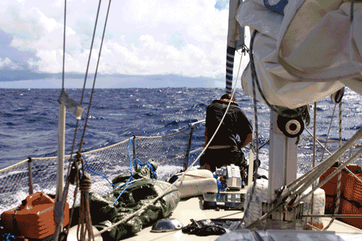 MYE SKVETT: Stillehavet er stort, og når været er dårlig, blir det meste ombord vått. Her er det FInn Olav som må opå fordekket og jobbe i liten storm. Men solen skinner ihvertfall som regel!