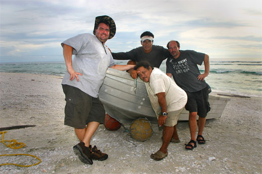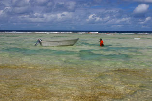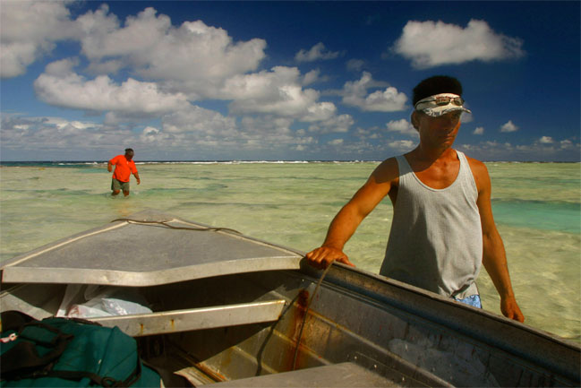 OPPASSERE: Palapi og Alatina er oppassere på Swains Island, og forbereder øyas infrastruktur til gjenoppbyggingen som er planlagt etter syklonen Percy i 2005. Her fører de lettbåten sin inn over det grunne revet og inn til stranden med oss i. Bak Palapi skimtes "the landing", ikke mer enn en liten sprekk i det massive revet!
