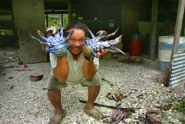 KOKOSNØTTKRABBER: Kokosnøttkrabben er en av de største delikatessene som finnes i hele Stillehavet. De har gått på land og lever i huler i sanden. Kokosnøttkrabben lever av å spise kokosnøtter som den klatrer opp i trærne for å finne. Her er Palapi med to fargerike og velvokste eksemplarer som snart skal i gryta!
