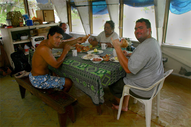 AVSKJEDSBANKETT: Hele gjengen samlet til avskjedsbankett. det er siste dag for oss, og vi må videre. Languster, uru (brødfrukt), kokt barracuda og kokosnøtt er på menyen. Vi spiste til vi holdt på å krepere!