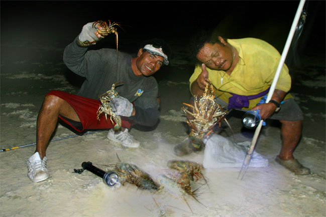 STOLTE JEGERE: To stolte jegere med nattas fangst av langustere. Med lommelykter og spiddestaker går de rundt på revet og leter etter byttet sitt.