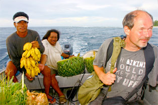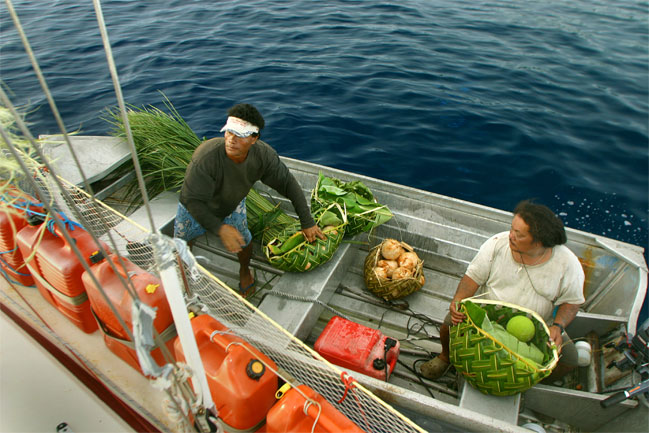 Da vi skulle dra ble karene litt stussne, og erklærte at de nok savnet konene og familiene sine. De laget en kjempebankett til avskjed for oss, og vi fikk med oss en masse flettede kurver fulle av fisk, kokosnøtter, brødfrukt, krabber, langustere, palmeblader i bunter og bananklaser. Samt noen små pakker de ville sende til sine familier. All kontakt med ”fastlandet” går nemlig via mellombølgeradio. De har ingen telefon og ingen regelmessig postgang. Vi var mye mer lastet når vi dro enn når vi kom! Forhåpentligvis vil innbyggerne på Swains Island snart kunne flytte tilbake til nye, syklonsikre hjem og nybygget kirke, skole og sykestue.