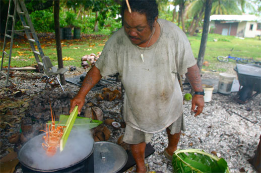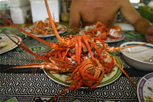LANGUSTER: I Stillehavet finnes det en spesiell type kreps som heter langustere. de har ikke klør og lever oppe på revet. Om nettene kommer de ut, og kan fanges. Også en delikatesse, rett fra gryta som her.