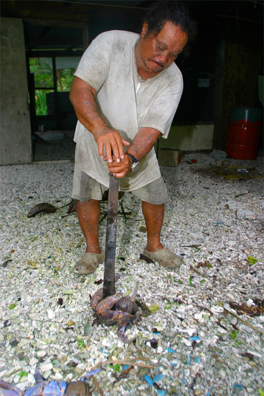 AVLIVING: Kokosnøttkrabbene er store, sterke og robuste. Her avlives en av Palapi med machete. Et raskt hugg mellom de to største klørne, og det er over.
