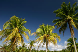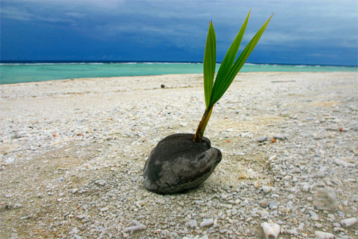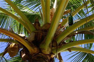 LIVETS TRE: "Livets tre" kaller polyneserne kokosnøttpalmen. De bruker treet og bladene til å bygge hus, kurver, båterog alt mulig annet med, og kokosnøtta kan spises på alle stadier, selv når den har slått et nytt skudd som her. Den kan drikkes, spises, brukes til hønsefor, myggmiddel og nesten alt annet du kan tenke deg. De lager også et meget sterkt tau av fibrene i det ytterste skallet.