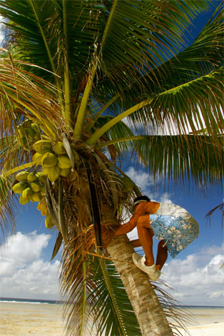 RENE APEKATTEN: Kunsten å klatre opp i kokospalmer etter kokosnøtter er barnelærdom i Polynesia. Alatina hopper opp og henter ned noen til oss. Rune drakk ni kokosnøtter bare den første dagen! Det var så varmt.