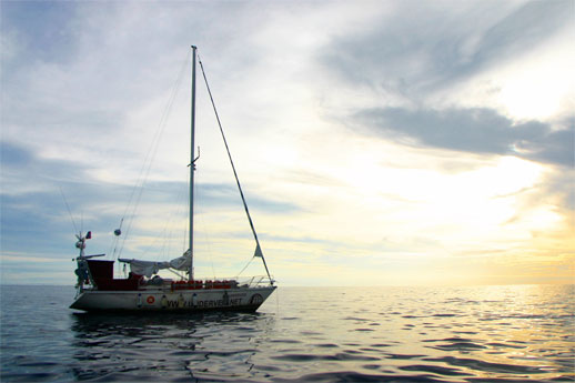 Vi på Underveis så en mulighet for å gjøre gjengjeld for den gjestfriheten vi har møtt her, og til å besøke en øy som praktisk talt ingen andre utenforstående noengang har besøkt. Som øyboere fra Røst vet vi også hvor kritisk det kan være med kommunikasjoner som bryter sammen. Vi meldte oss frivillig, og allerede neste morgen lastet vi ombord forsyningene som skulle til de to gutta på Swains, og satte seil. Distansen på 220 mil hver vei, tilsvarer omtrent distansen Bergen – Shetland. Vi brukte to dager dit, og skal si at gleden var stor da seilene våre dukket opp i horisonten! Gutta kom rasende ut i den vesle aluminiumsbåten sin og ønsket oss hjertelig velkommen.